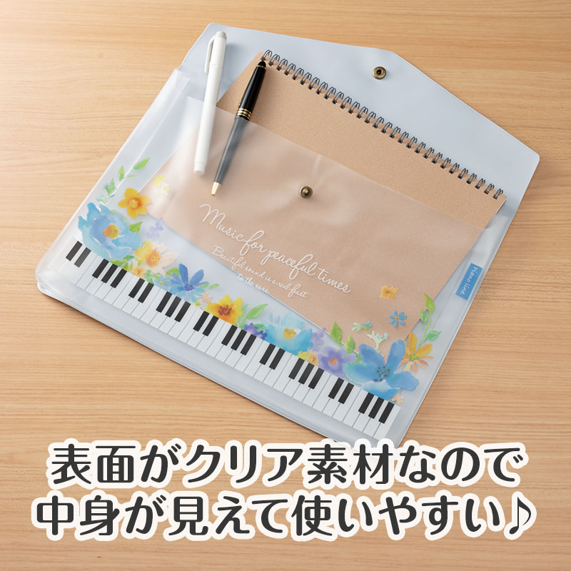 表面はクリア素材で中身がひと目でわかるので、準備や片付けがスムーズ。軽量仕様なのでレッスンへの持ち運びも快適です。