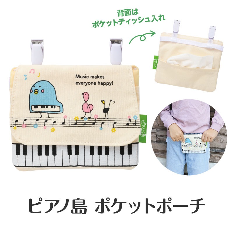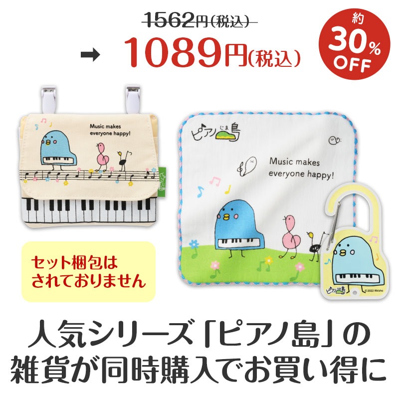 | 素材 | ピアノ島 ポケットポーチ/綿・ポリエステル ピアノ島 アクリルカラビナ/アクリル樹脂 無撚糸ガーゼハンカチ/綿 |