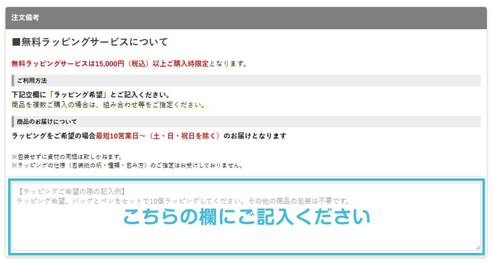ご購入金額が15,000円(税込)に満たない場合は、誠に申し訳ございませんが無料ラッピングサービスをご利用いただくことができません。