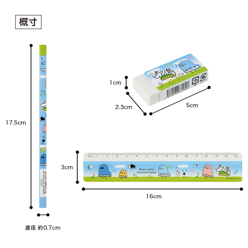 | サイズ | 鉛筆/直径約0.7×17.5cm 定規/約3×16cm 消しゴム/約2.3×5×1cm |